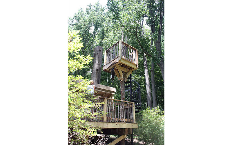 Working closely with the group of retired but hard working volunteers, CKd designed the fun and sustainable exhibit using recycled and found materials including lumber and posts milled from fallen hemlock trees on the site. The design features a hideaway open clubhouse with a green roof and a lookout perch accessed by a spiral stair lent by the Iron Shop in Broomall.